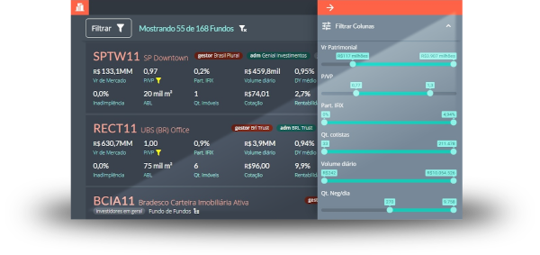 Ir para o super filtroVeja todos os FIIs em uma tabela dinâmica onde você consegue filtrar e comparar de acordo com as características que você quiser, de um jeito rápido e descomplicado. É só escolher os indicadores e deslizar para os valores desejados.